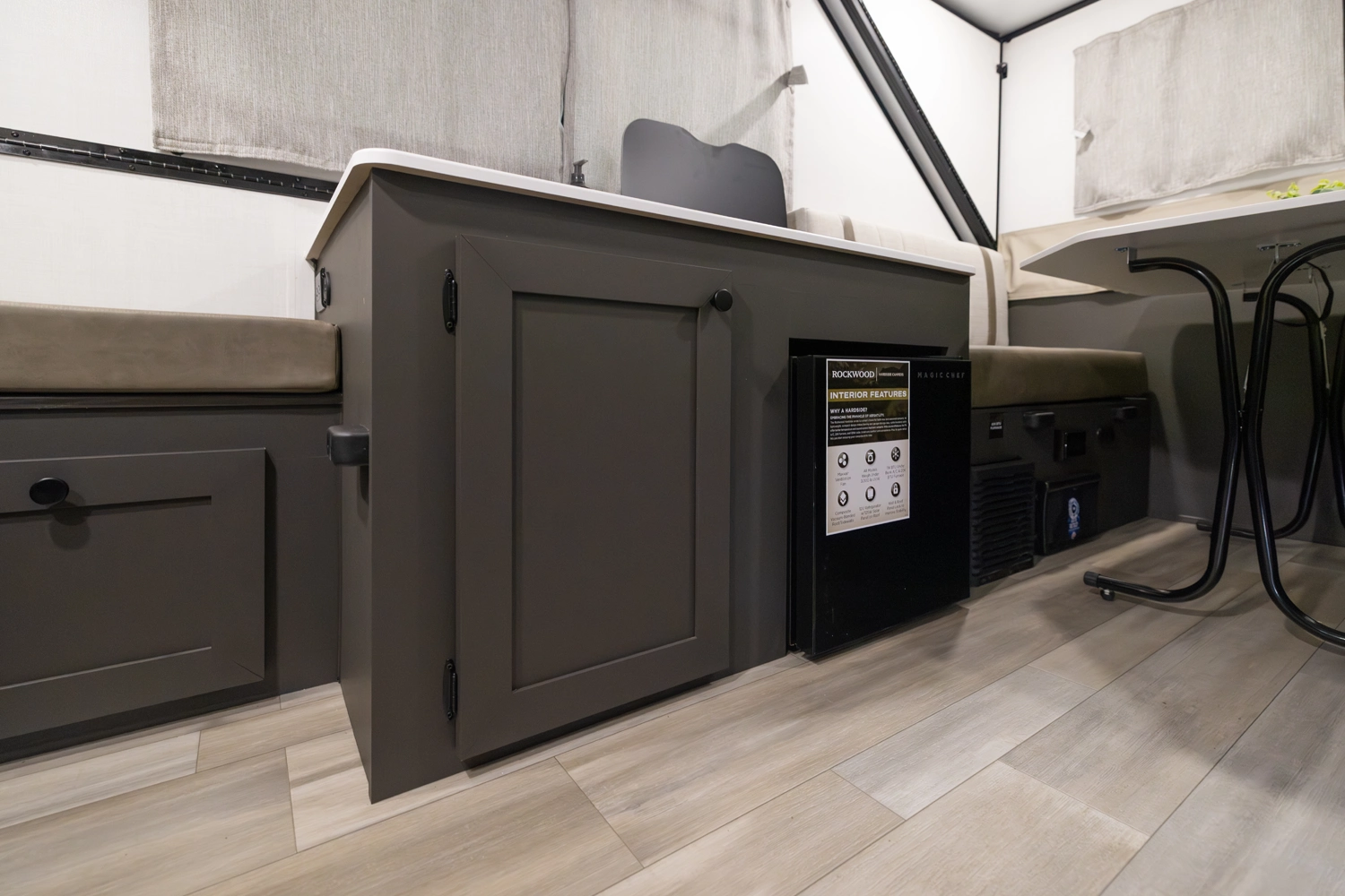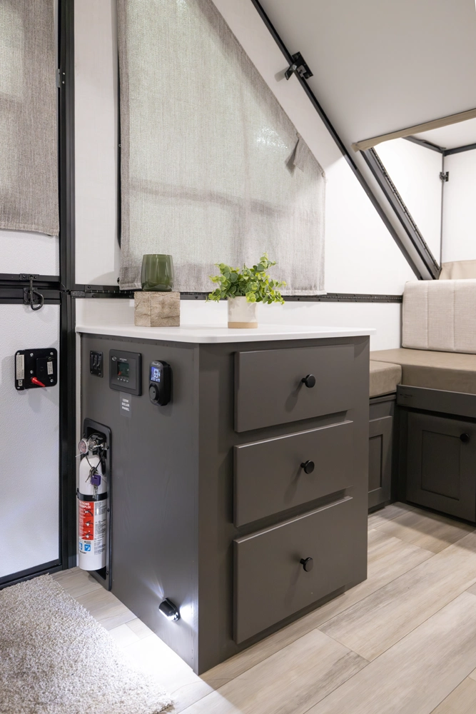 The Rockwood A121FD is a thoughtfully designed A-frame camper that maximizes space. It features a front 45" x 80" dinette, perfect for dining and relaxing. In the living area, you'll find a sink, cooktop, and small refrigerator. At the rear, a spacious 54" x 80" gaucho bed awaits, and with a double dormer, you get increased head height on both sides for extra comfort.