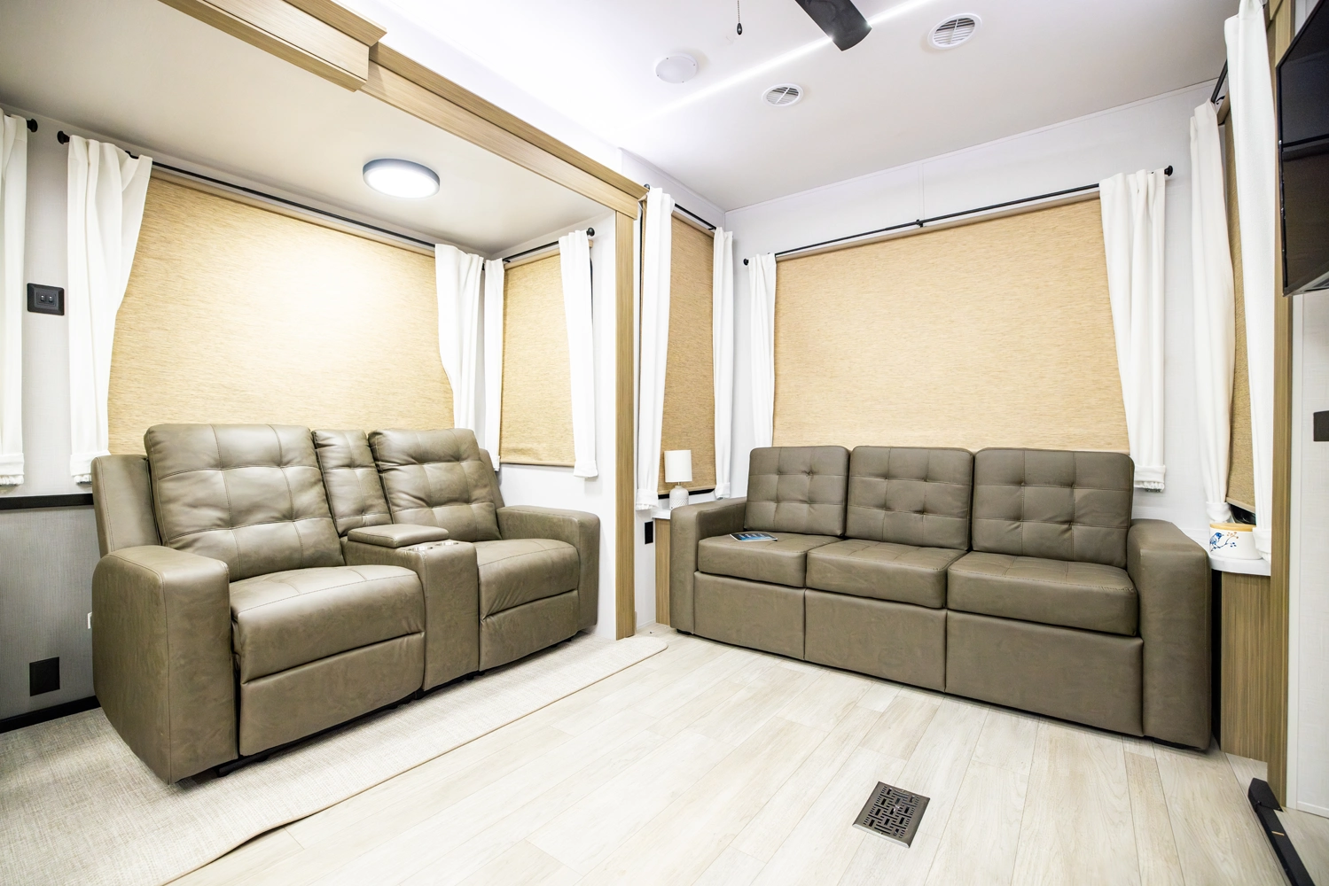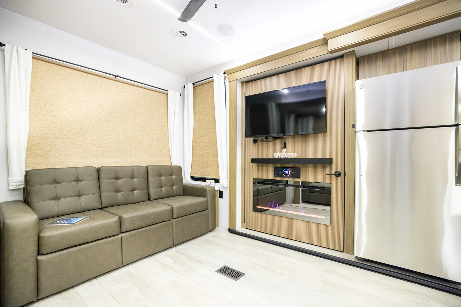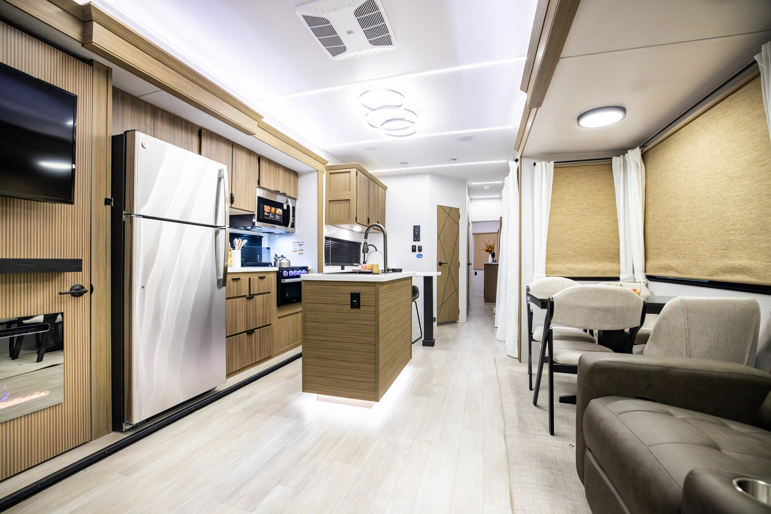 The 40RLB is an open floorplan that maximizes space for a residential cottage look and feel. The large king bedroom provides plenty of storage and washer/dryer hookup. The bathroom offers a walk-in shower with built-in seat, skylight, and linen cabinets. The island kitchen provides residential appliances and plenty of room for all the cooking essentials. Don’t forget the awesome view out the panoramic windows.